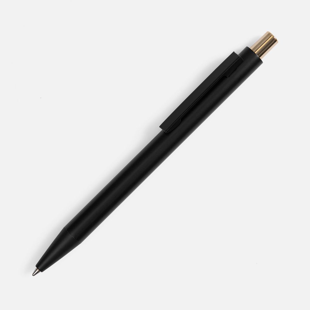 Ручка строгих форм в черном матовом корпусе с цветными деталями, которая точно может удивить гравировка на ней вскрывается цветом в тон кнопке.