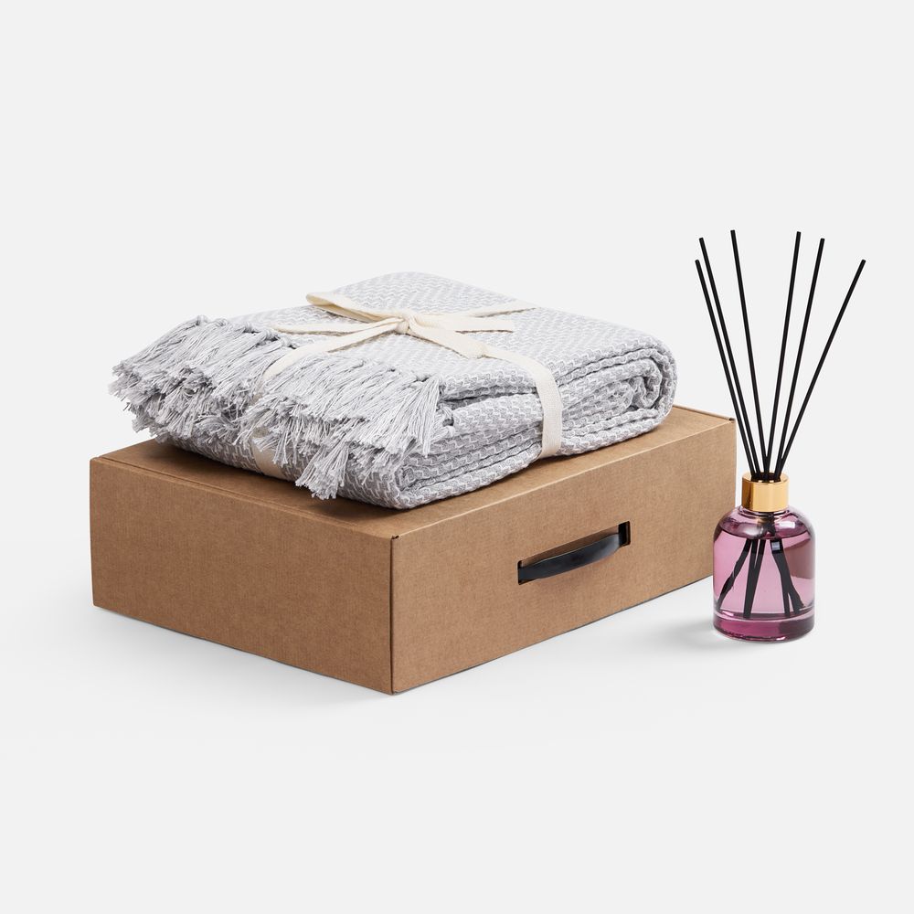 плед - хлопок 80%, полиэстер 20%, плотность 260 г/мb; флакон - стекло, палочки из файбера; коробка - микрогофрокартон