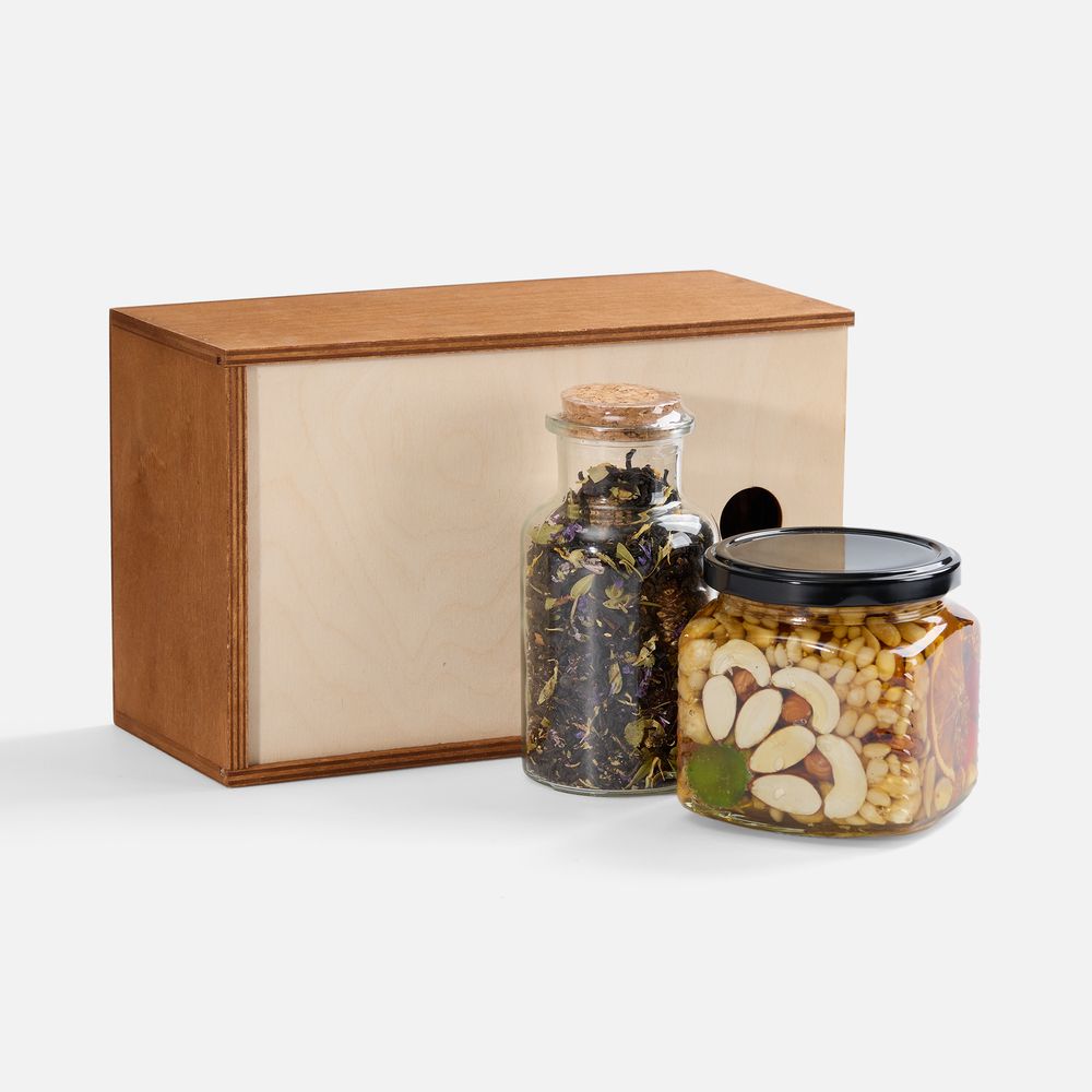 В наборе собраны дары сибирской природы: ароматный медовый десерт с хрустящими орехами, цукатами и семенами и травяной чай [Сила Сибириk. В основе чая крепкий черный чай с лесными травами, ягодами и хвойными нотами, создающими гармоничный вкус со сладковатым послевкусием. Все упаковано в аккуратный деревянный ящик такой набор станет практичным подарком или приятным дополнением к вечернему чаепитию для тех, кто любит натуральные вкусы и атмосферу уюта.Характеристики: