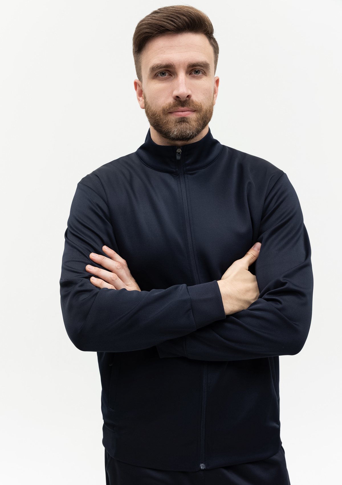 Мужская олимпийка прямого силуэта с воротником-стойкой, втачным рукавом, прорезным карманом и застежкой на молнию. Манжет и пояс изделия оформлены широкой эластичной резинкой для дополнительной защиты от ветра и сохранения тепла.