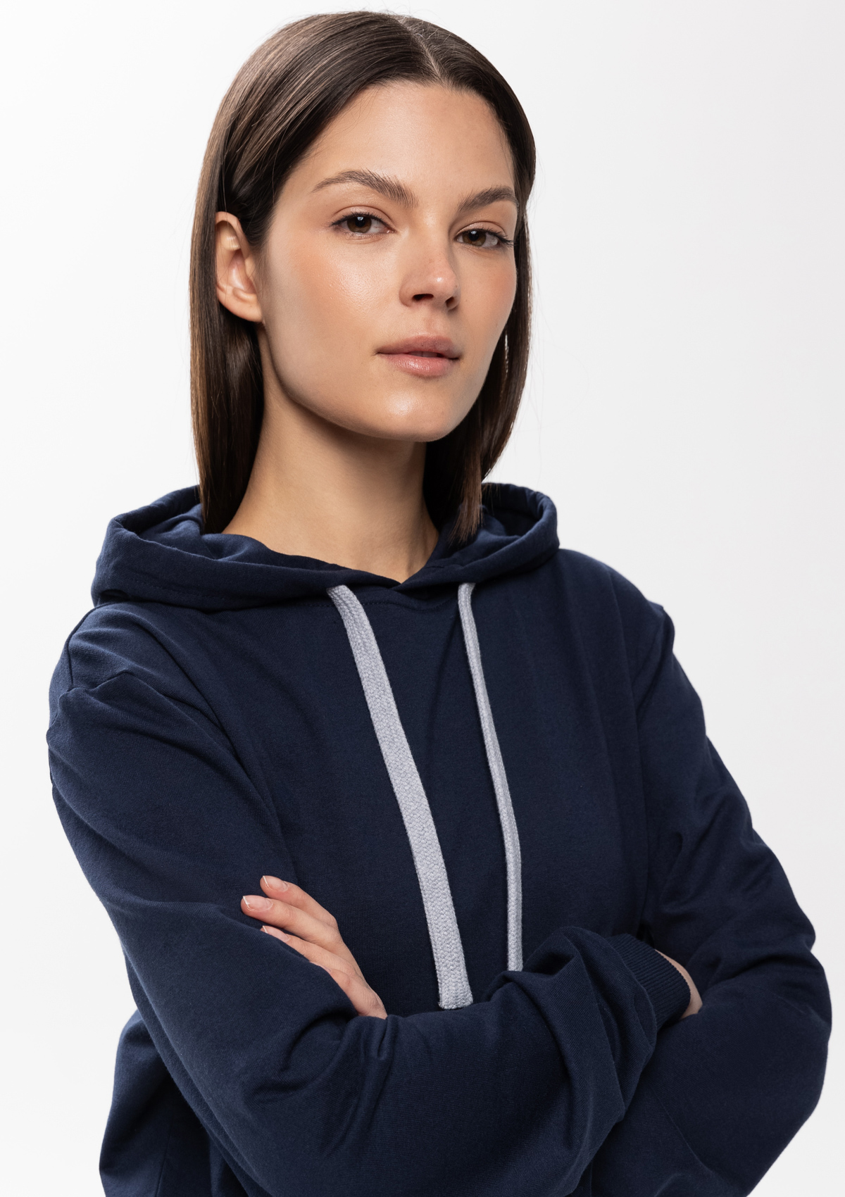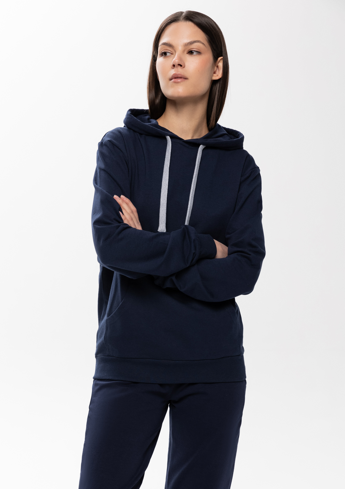 Толстовка прямого силуэта с капюшоном, втачным рукавом и карманом-кенгуру. Капюшон дополнен шнурком для регулирования прилегания, манжет и низ изделия оформлены широкой эластичной резинкой. Возможно два варианта исполнения: контрастные шнурок и бейка/шнурок и бейка в цвет толстовки.<br />