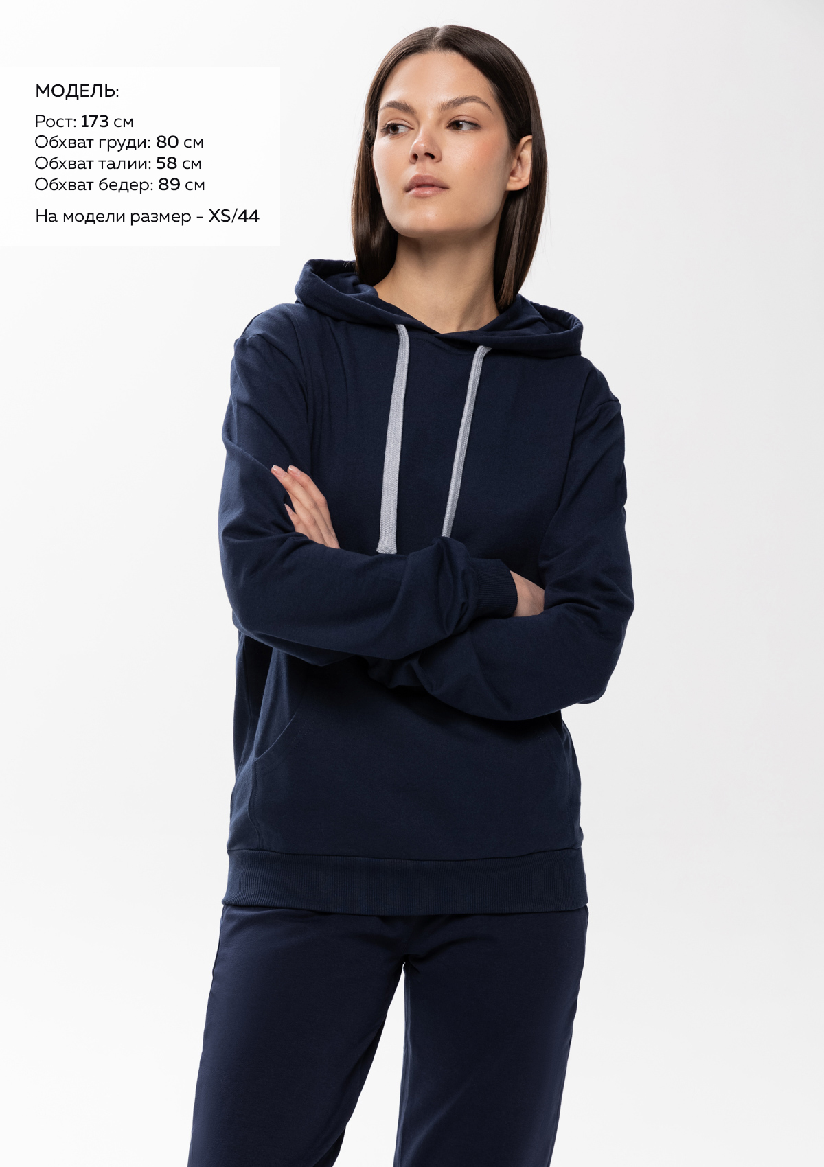Размер женского худи: XXS/42. Параметры модели: рост 173 см.; обхват груди 80 см.; обхват талии 58 см.; обхват бедер 89 см.<br />