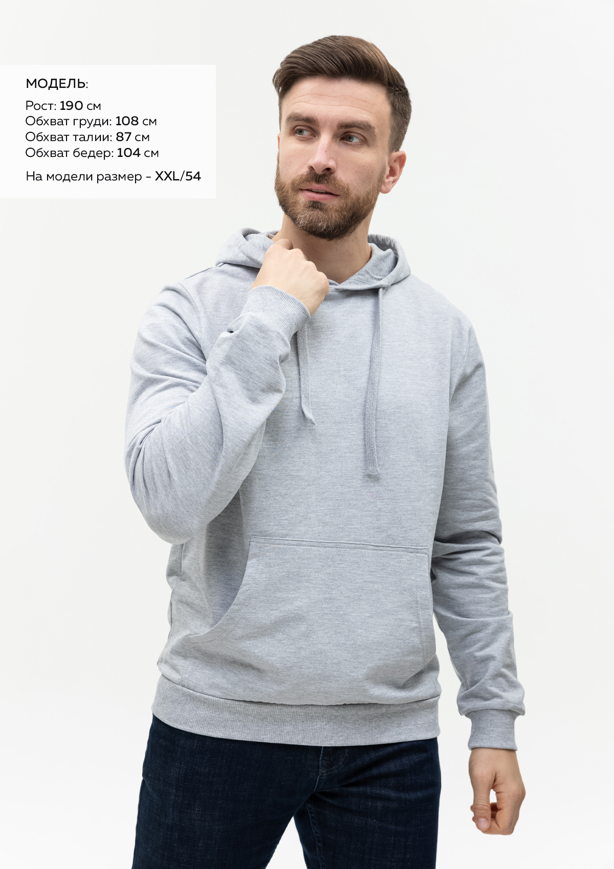 Размер мужского худи: XL/52. Параметры модели: рост 190 см.; обхват груди 108 см.; обхват талии 87 см.; обхват бедер 104 см.Характеристики: