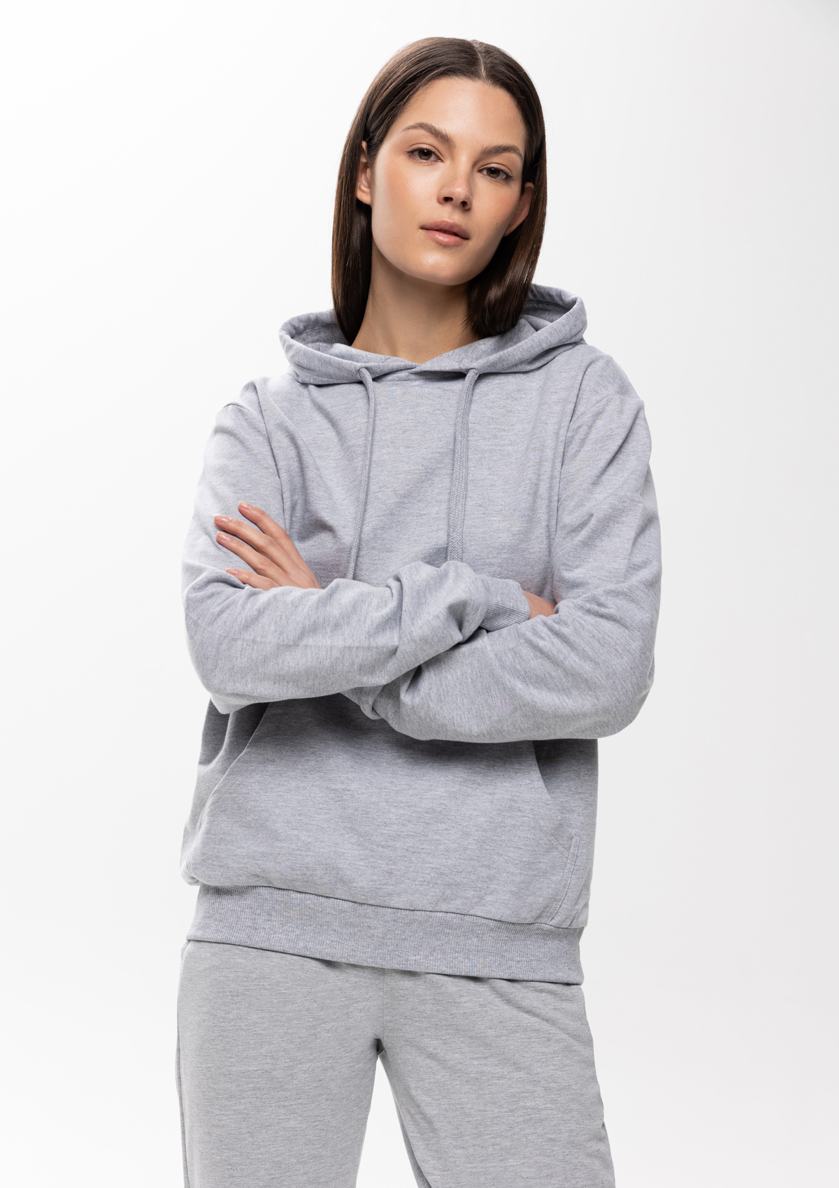 Толстовка прямого силуэта с капюшоном, втачным рукавом и карманом-кенгуру. Капюшон дополнен шнурком для регулирования прилегания, манжет и низ изделия оформлены широкой эластичной резинкой. Возможно два варианта исполнения: контрастные шнурок и бейка/шнурок и бейка в цвет толстовки.<br />