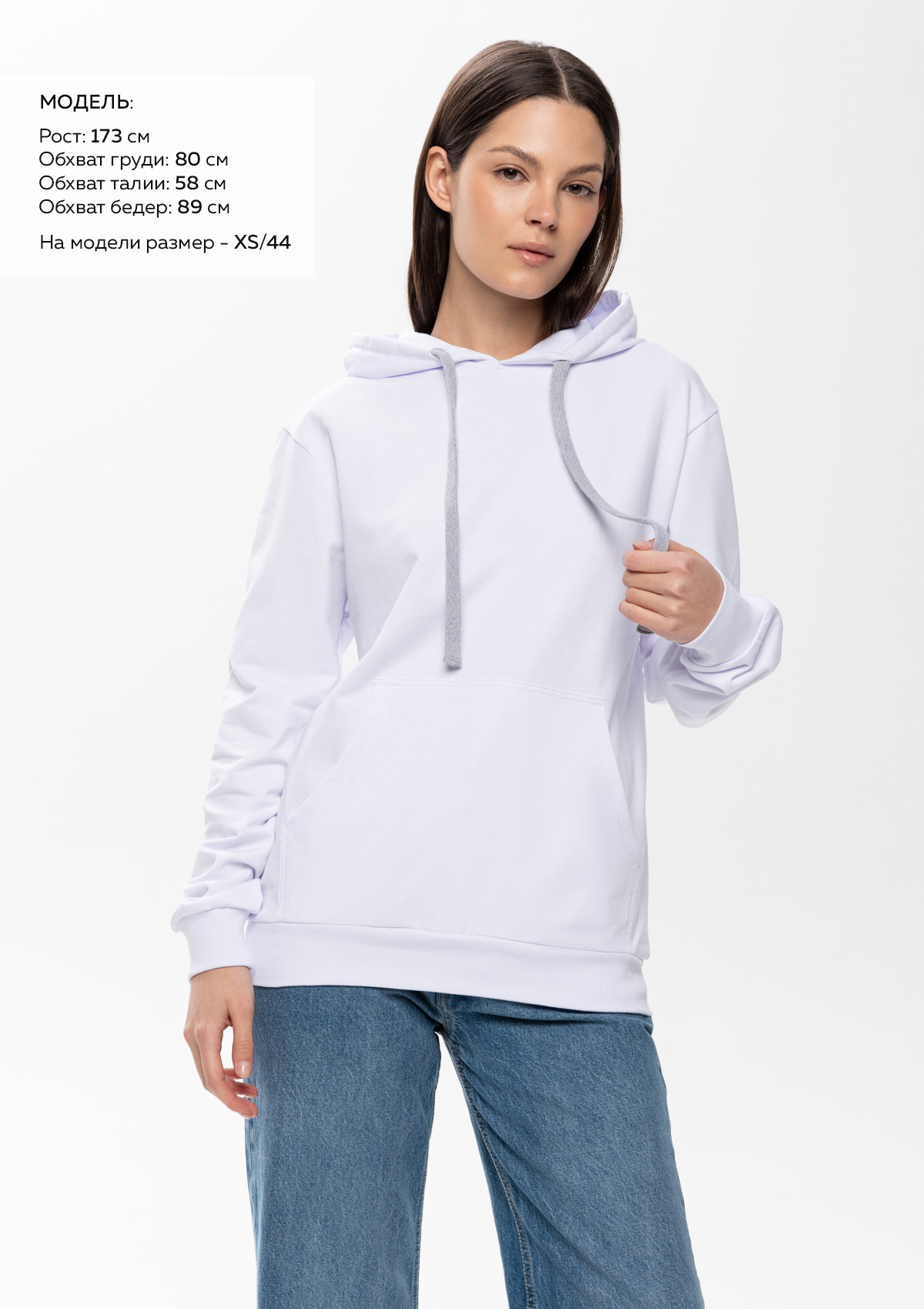 Размер женского худи: XXS/42. Параметры модели: рост 173 см.; обхват груди 80 см.; обхват талии 58 см.; обхват бедер 89 см.<br />