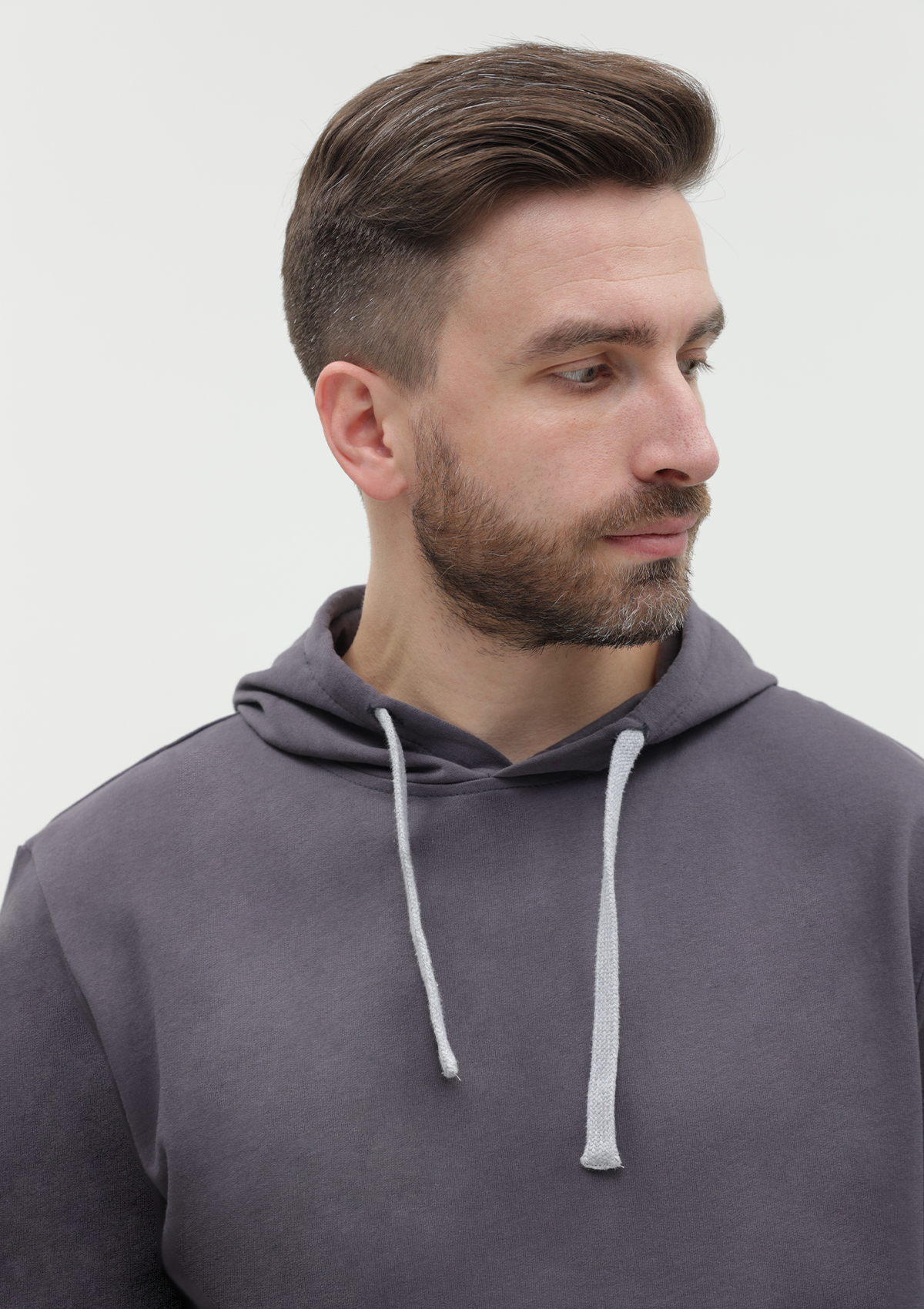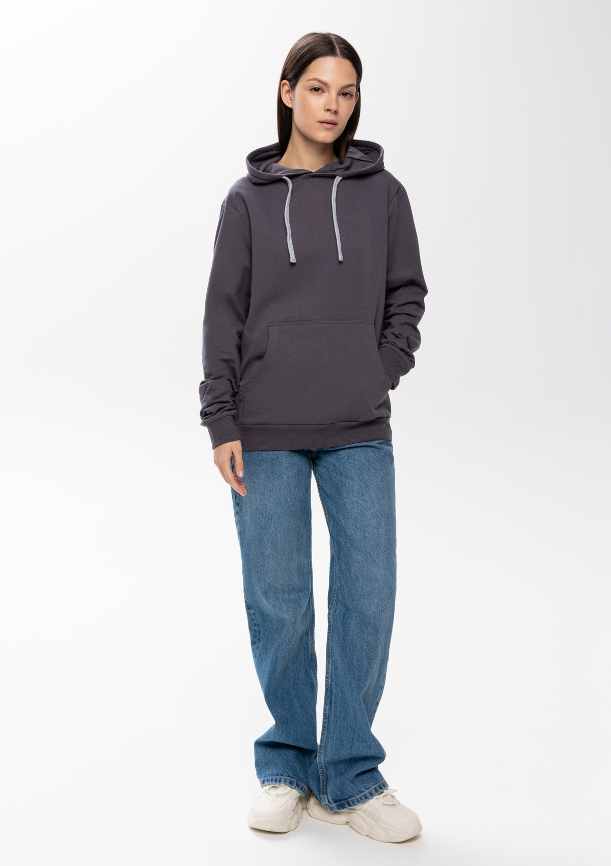 Толстовка прямого силуэта с капюшоном, втачным рукавом и карманом-кенгуру. Капюшон дополнен шнурком для регулирования прилегания, манжет и низ изделия оформлены широкой эластичной резинкой. Возможно два варианта исполнения: контрастные шнурок и бейка/шнурок и бейка в цвет толстовки.<br />