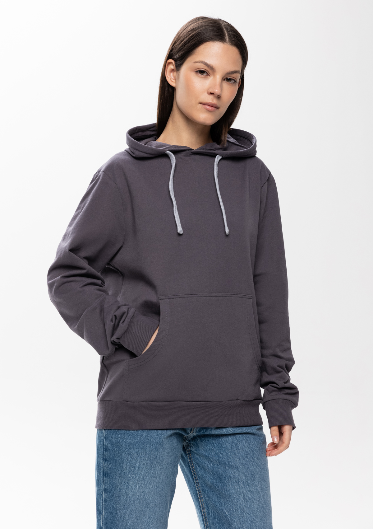 Толстовка прямого силуэта с капюшоном, втачным рукавом и карманом-кенгуру. Капюшон дополнен шнурком для регулирования прилегания, манжет и низ изделия оформлены широкой эластичной резинкой. Возможно два варианта исполнения: контрастные шнурок и бейка/шнурок и бейка в цвет толстовки.<br />