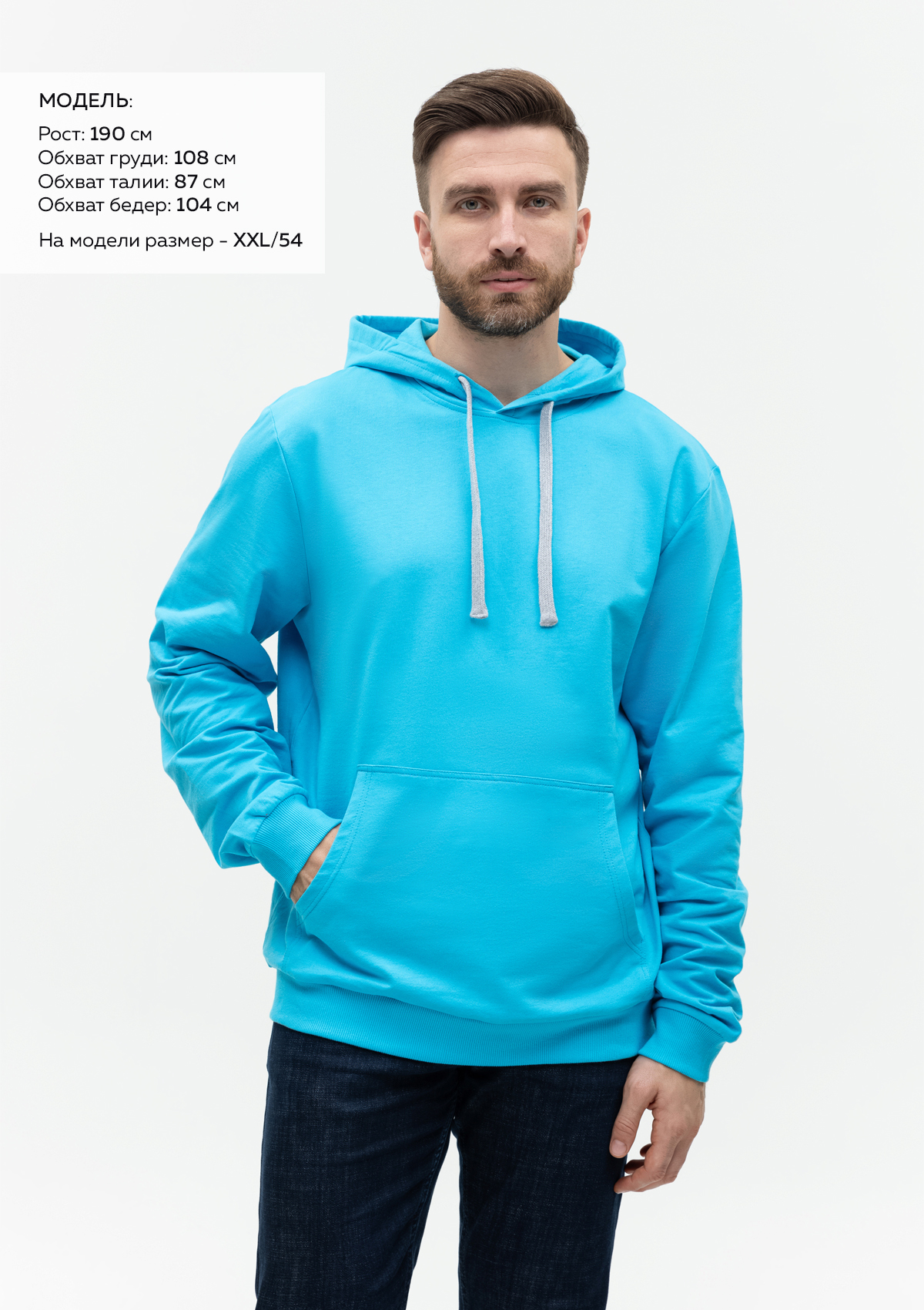 Размер мужского худи: XL/52. Параметры модели: рост 190 см.; обхват груди 108 см.; обхват талии 87 см.; обхват бедер 104 см.Характеристики: