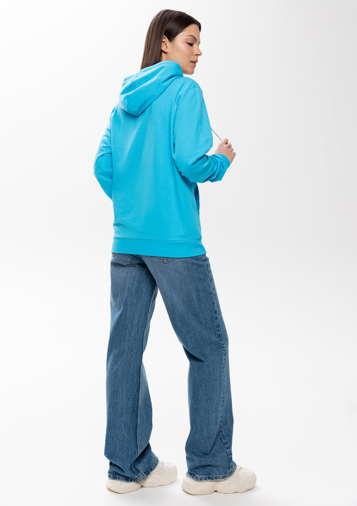 Толстовка прямого силуэта с капюшоном, втачным рукавом и карманом-кенгуру. Капюшон дополнен шнурком для регулирования прилегания, манжет и низ изделия оформлены широкой эластичной резинкой. Возможно два варианта исполнения: контрастные шнурок и бейка/шнурок и бейка в цвет толстовки.<br />