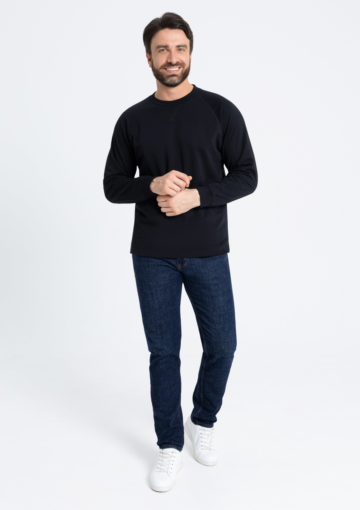 Свободный силуэт, округлый вырез, рукав-реглан и декоративные элементы, отсылающие к классическому крою. Ворот и манжет выполнены широкой эластичной резинкой. <br />