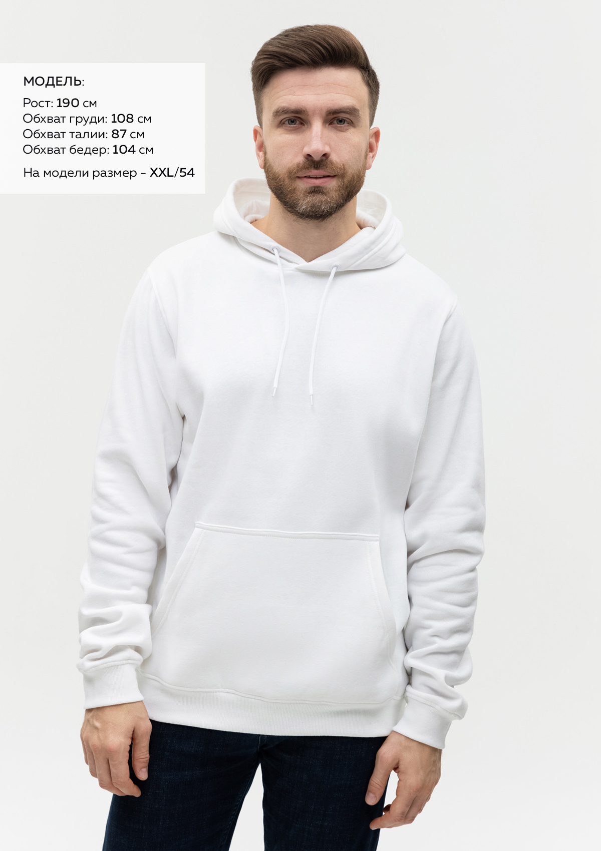 Размер мужского худи: XXL/54. Параметры модели: рост 190 см.; обхват груди 108 см.; обхват талии 87 см.; обхват бедер 104 см.Характеристики: