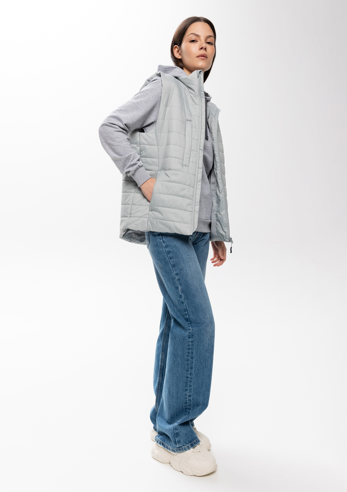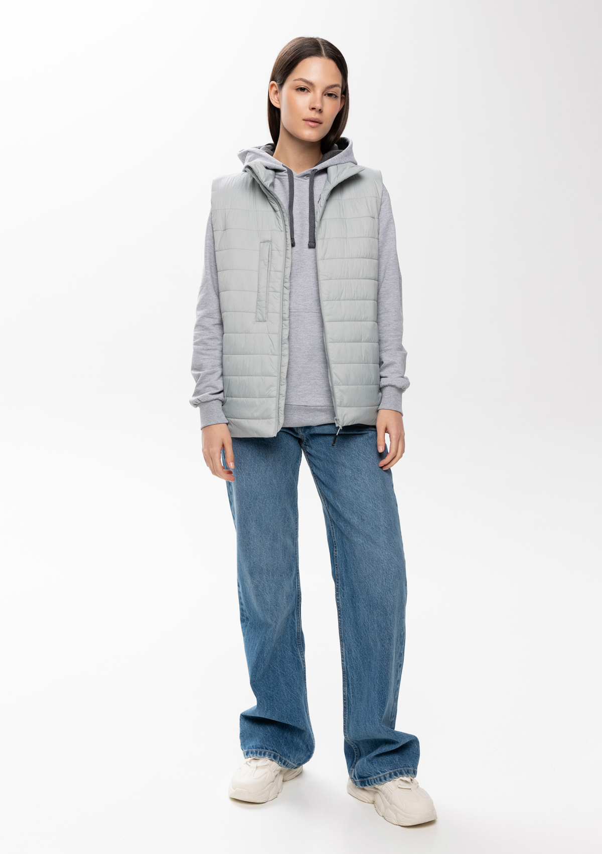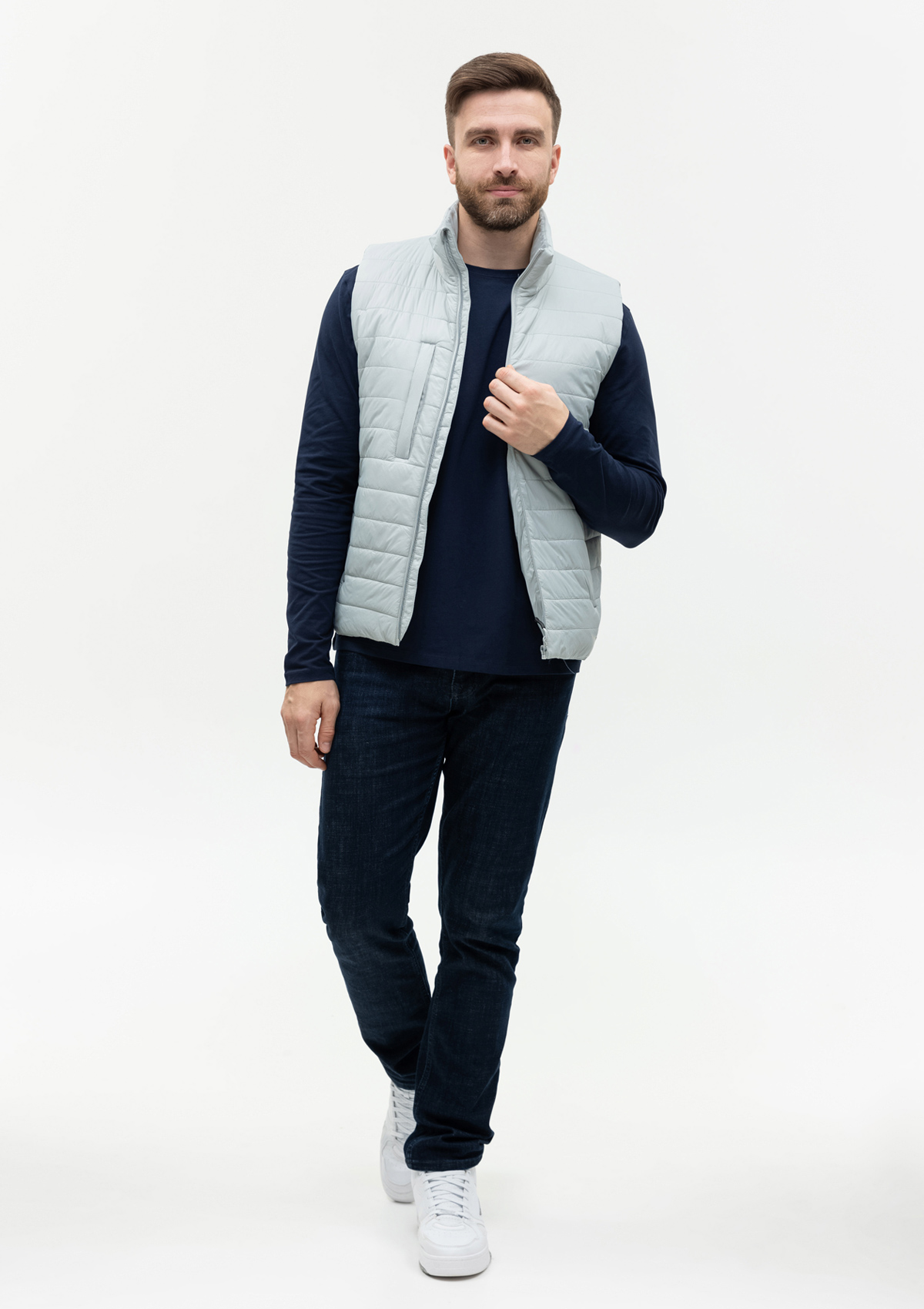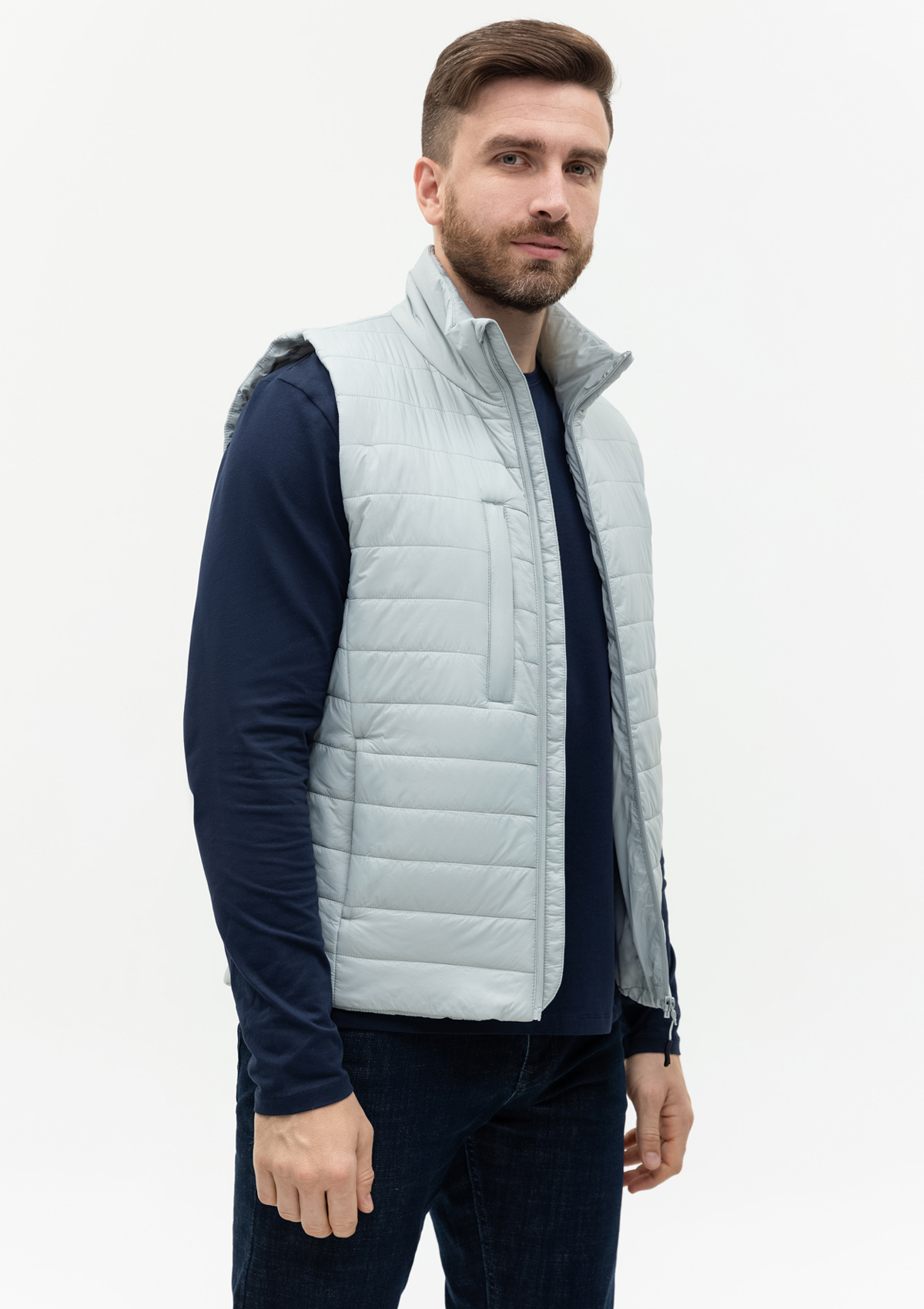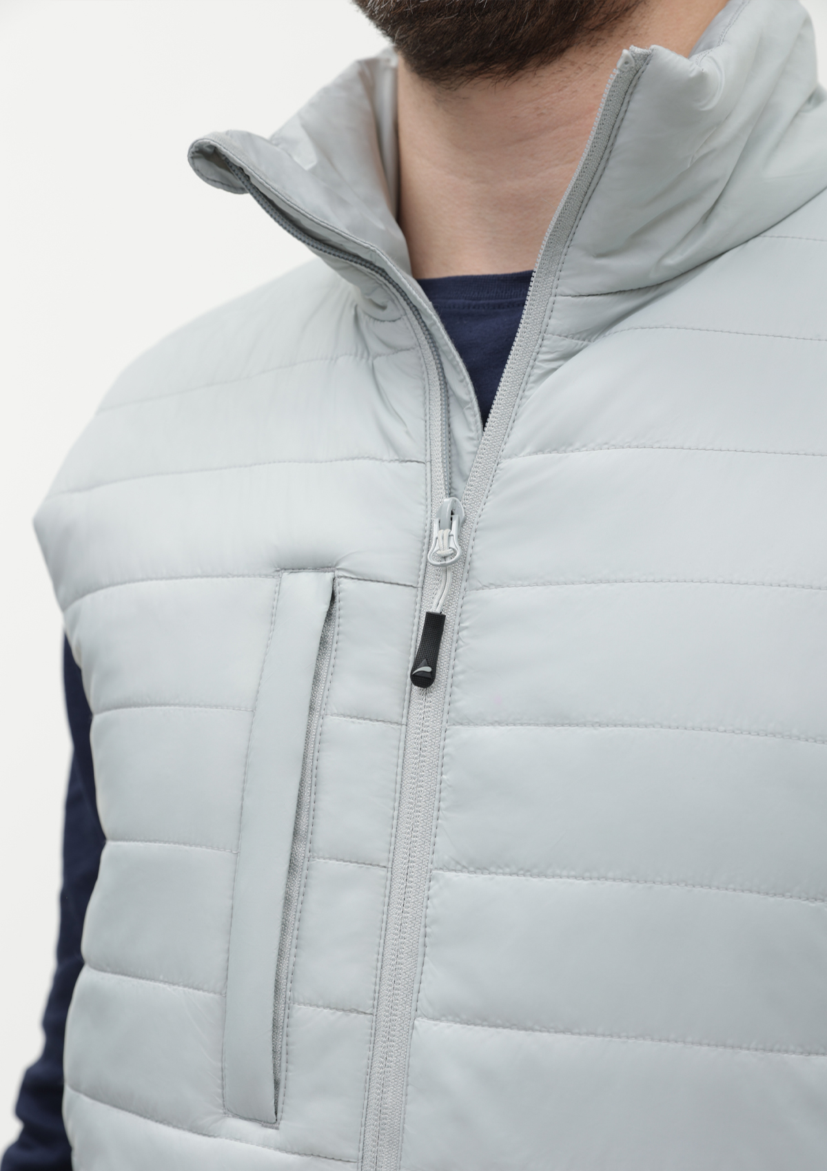 Ультралегкий жилет прямого силуэта с горизонтальной стежкой, воротником-стойкой, функциональным карманом по правой полочке, прорезным карманом и застежкой на молнию с внутренней ветрозащитной планкой. В комплекте прилагается сумка-чехол (технологии нанесения: шелкотрансфер и ДТФ-печать).<br />