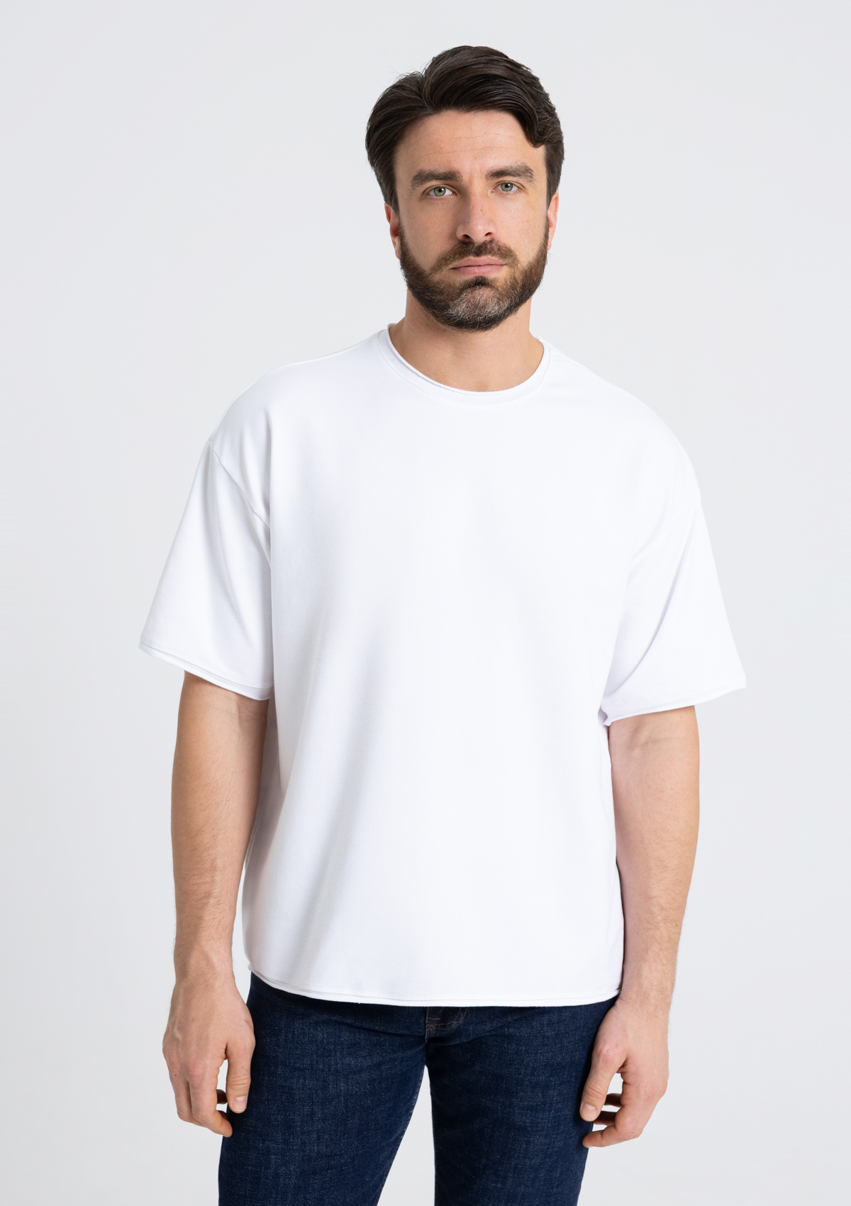 Футболка оверсайз-силуэта со спущенной линией плеча и необработанным краем рукава, горловины и по низу изделия.<br />