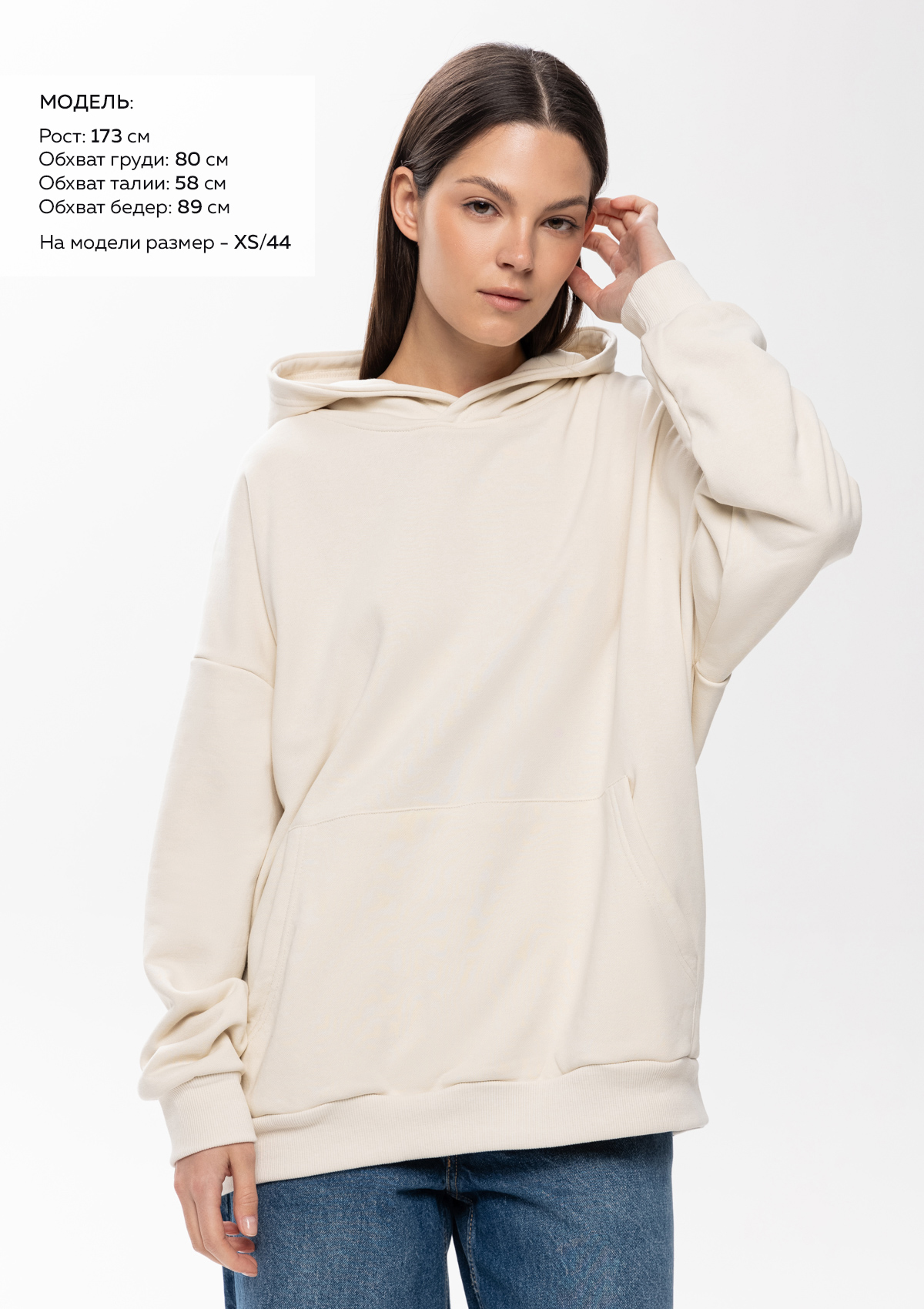 Размер женского худи: XS/44. Параметры модели: рост 173 см.; обхват груди 80 см.; обхват талии 58 см.; обхват бедер 89 см.<br />