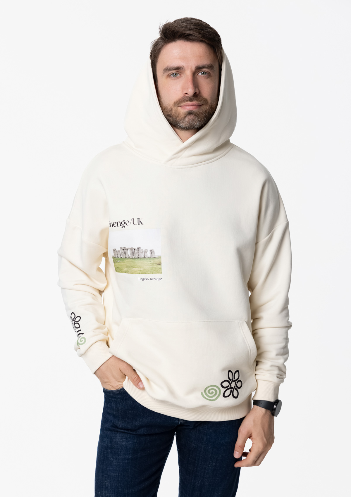 Размер мужского худи: XL/52. Параметры модели: рост 190 см.; обхват груди 108 см.; обхват талии 87 см.; обхватPбедерP104Pсм.Характеристики: