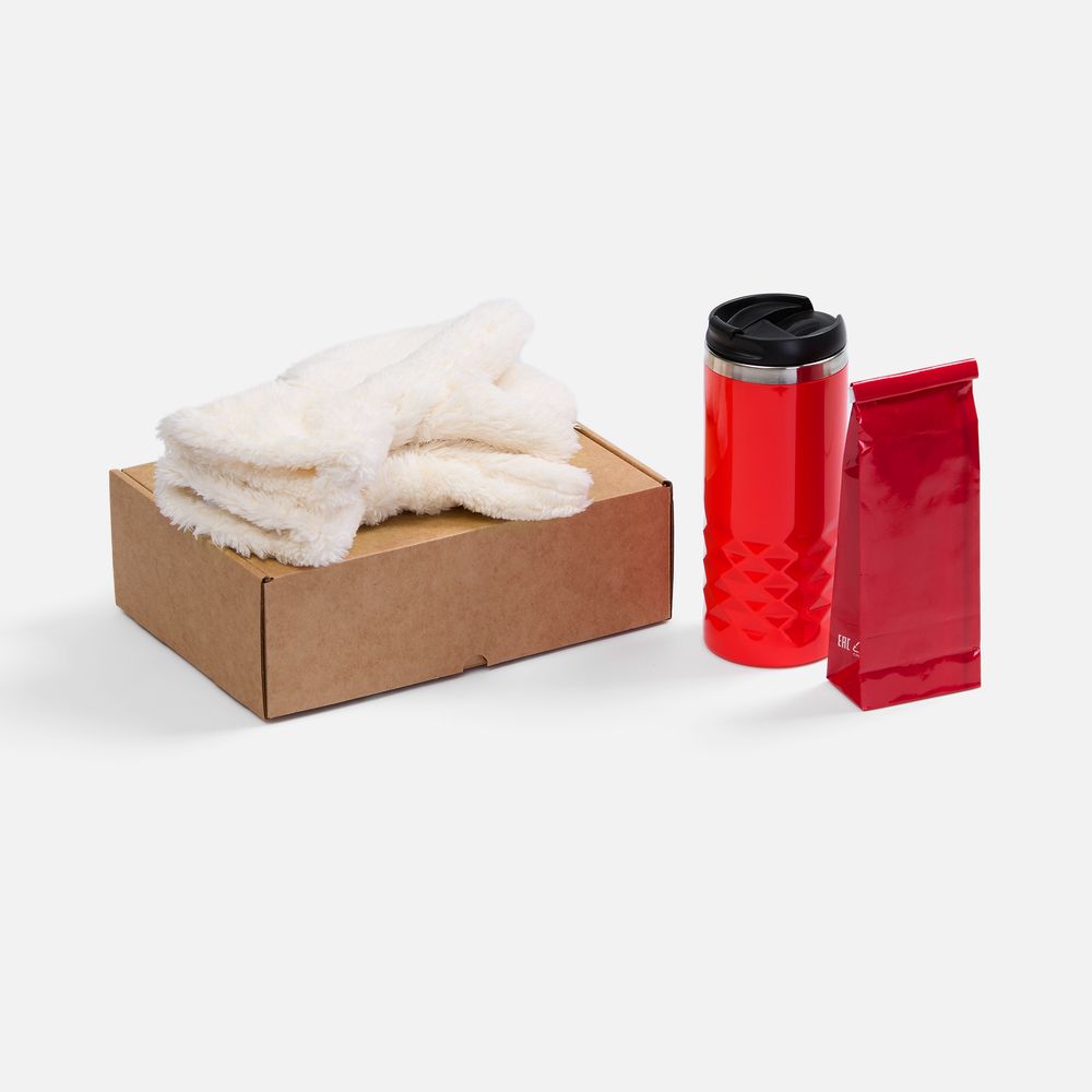 термостакан, крышка - пластик; внутренняя стенка - нержавеющая сталь; варежки - полиэстер 100%, плотность 280 г/мb, длинноворсовый флис; коробка - микрогофрокартон