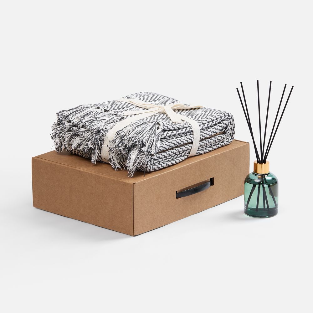 плед - хлопок 80%, полиэстер 20%, плотность 260 г/мb; флакон - стекло, палочки из файбера; коробка - микрогофрокартон