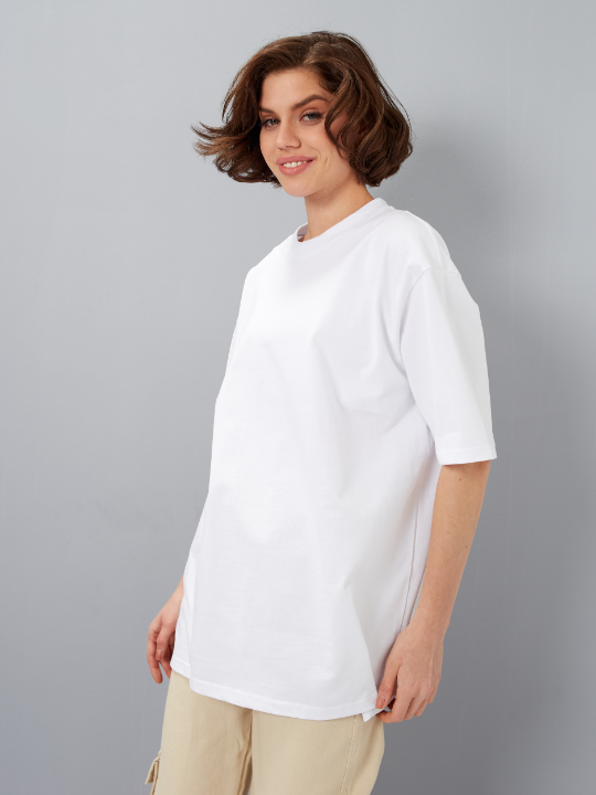 Универсальная футболка силуэта-oversize с округлым воротом и спущенной линией плеча.<br />