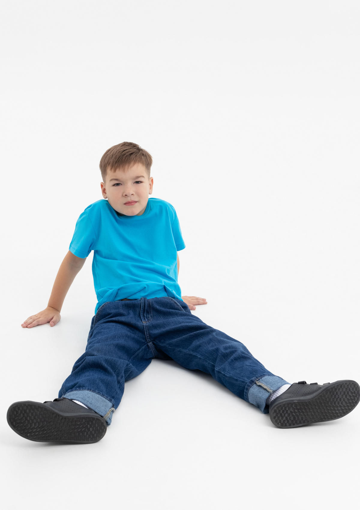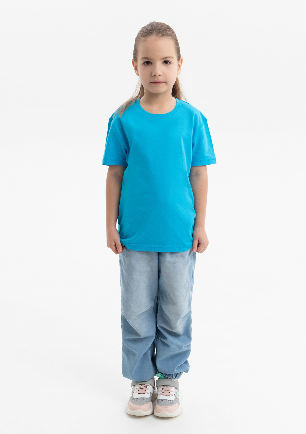 Детская футболка свободного силуэта с округлым воротом и втачным рукавом. Плечевые швы и шов горловины спинки усилены настрочной бейкой из основного полотна.<br />