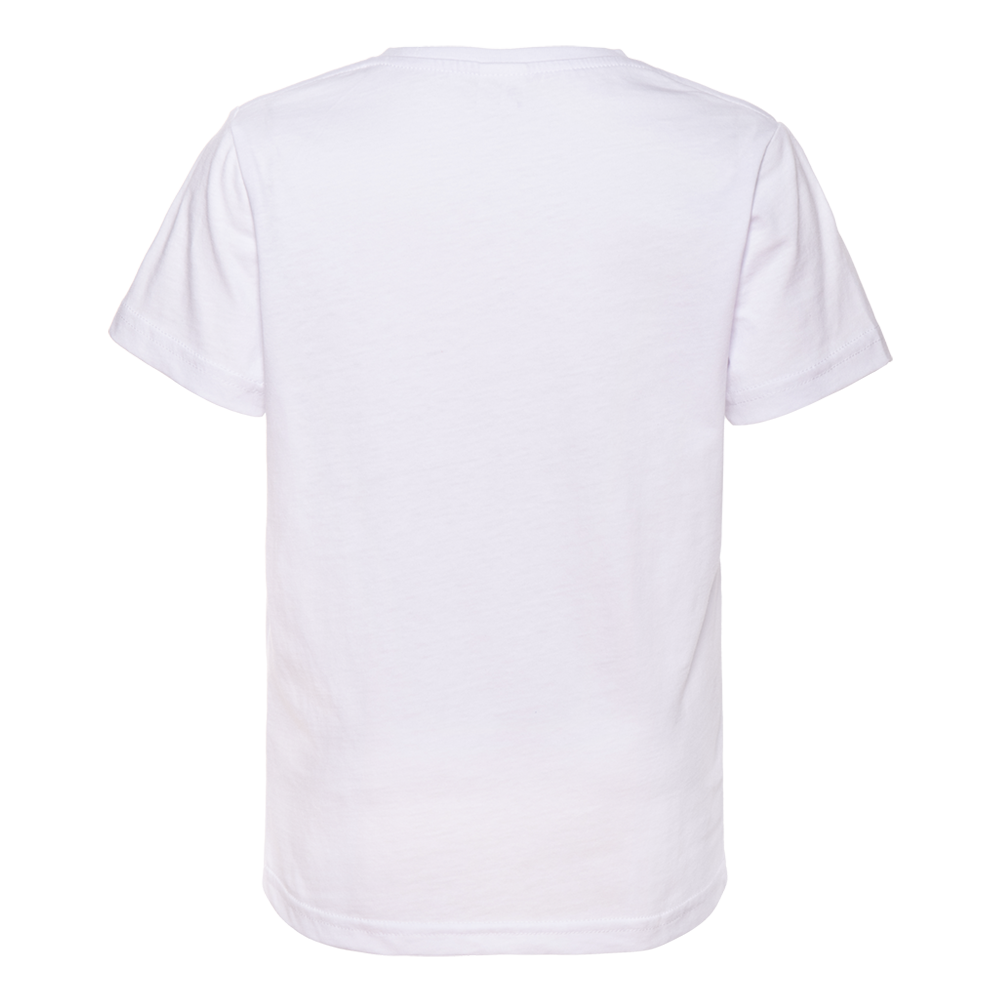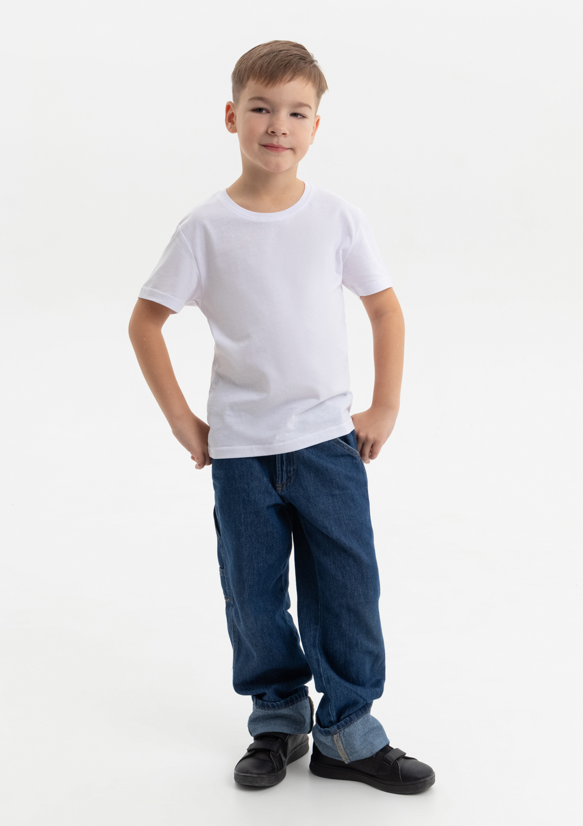 Детская футболка свободного силуэта с округлым воротом и втачным рукавом. Плечевые швы и шов горловины спинки усилены настрочной бейкой из основного полотна.<br />