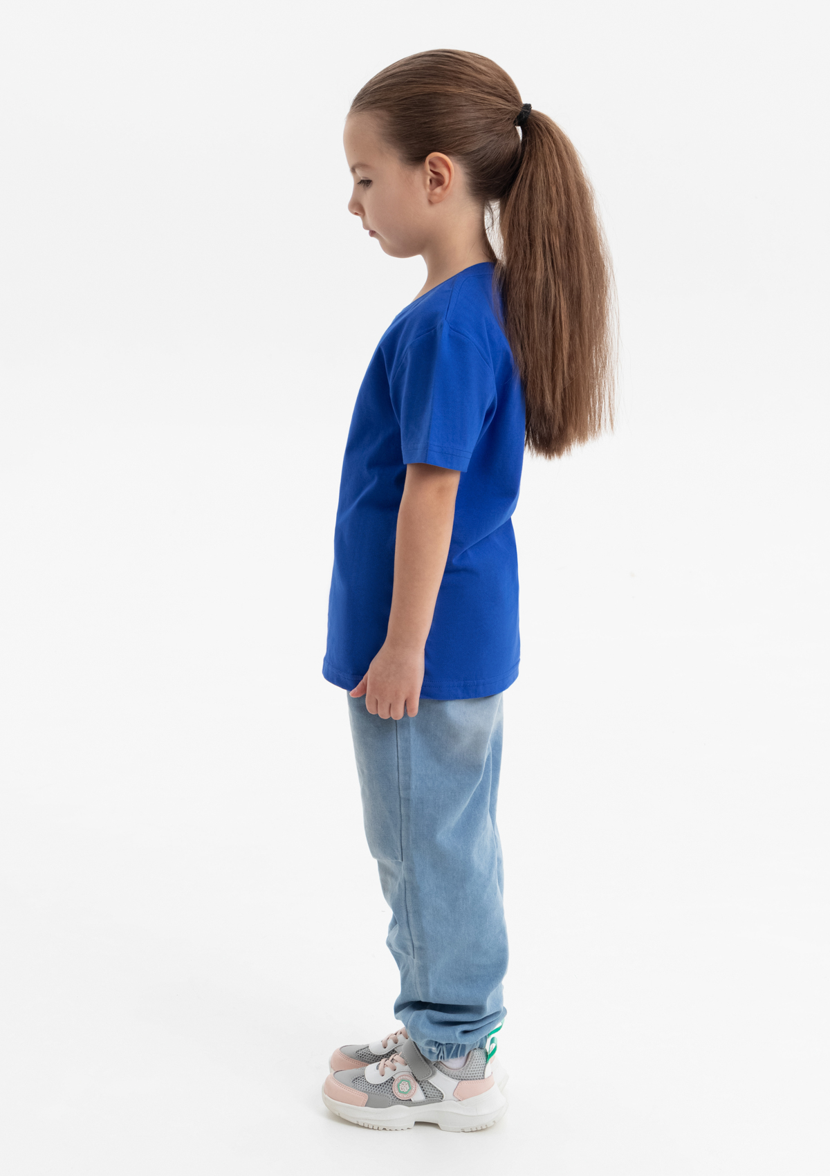 Детская футболка свободного силуэта с округлым воротом и втачным рукавом. Плечевые швы и шов горловины спинки усилены настрочной бейкой из основного полотна.<br />