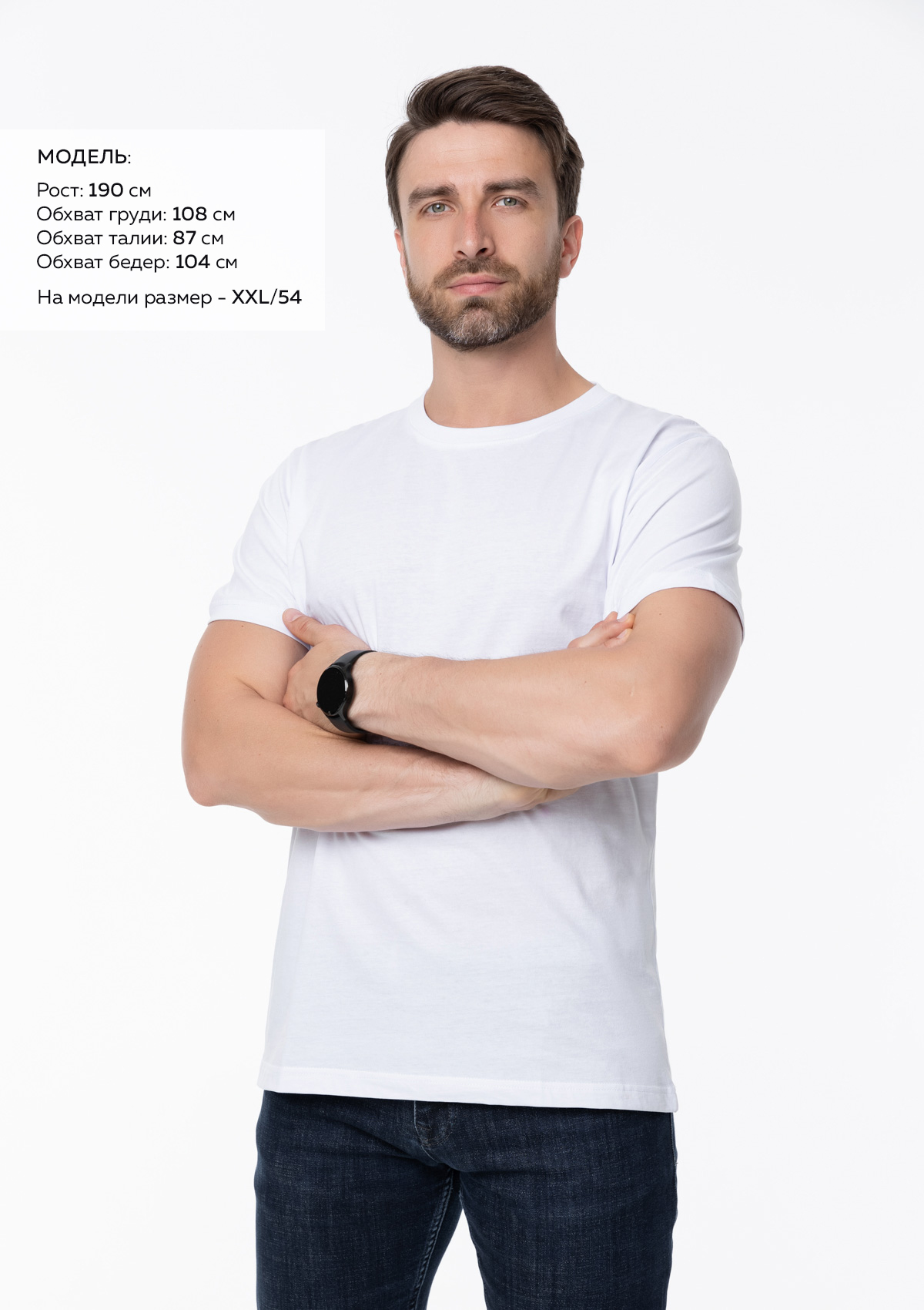 Размер мужской футболки: XXL/54. Параметры модели: рост 190 см.; обхват груди 108 см.; обхват талии 87 см.; обхватPбедерP104Pсм.Характеристики:
