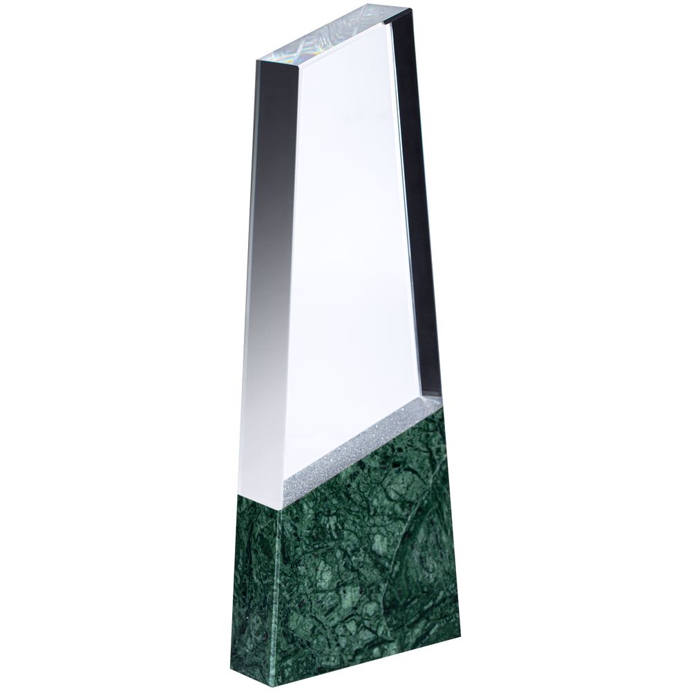 На основании из серпентина закреплен блок из стекла К9, в основе которого лежит оптическое боросиликатное стекло. Эту марку стекла отличает низкий процент посторонних включений, высокий показатель преломления и высокая прозрачность идеальные качества для изготовления наград премиального уровня.