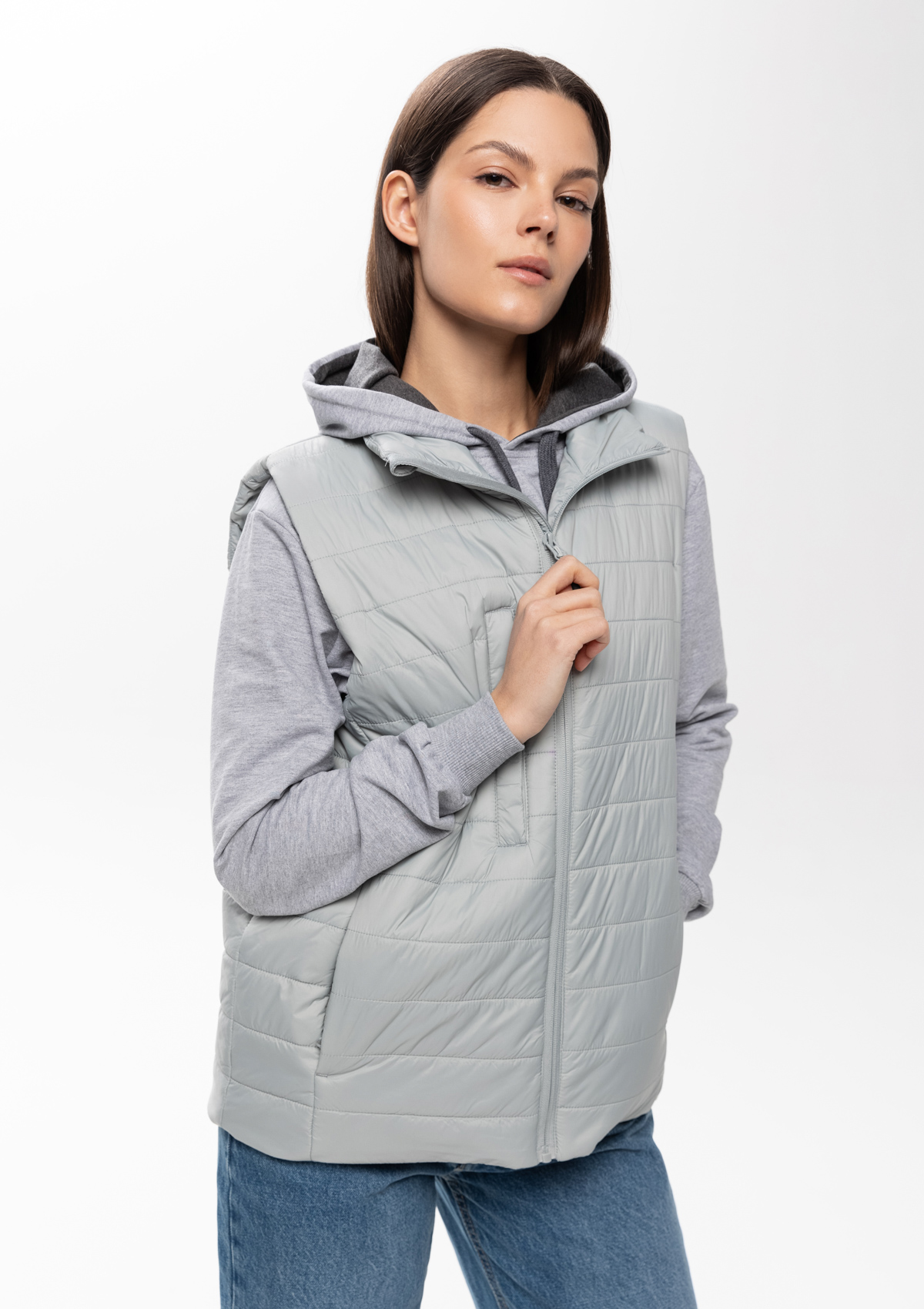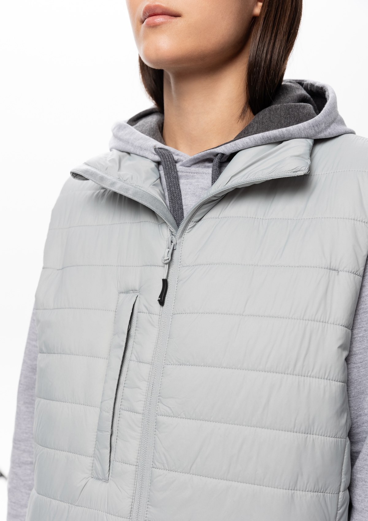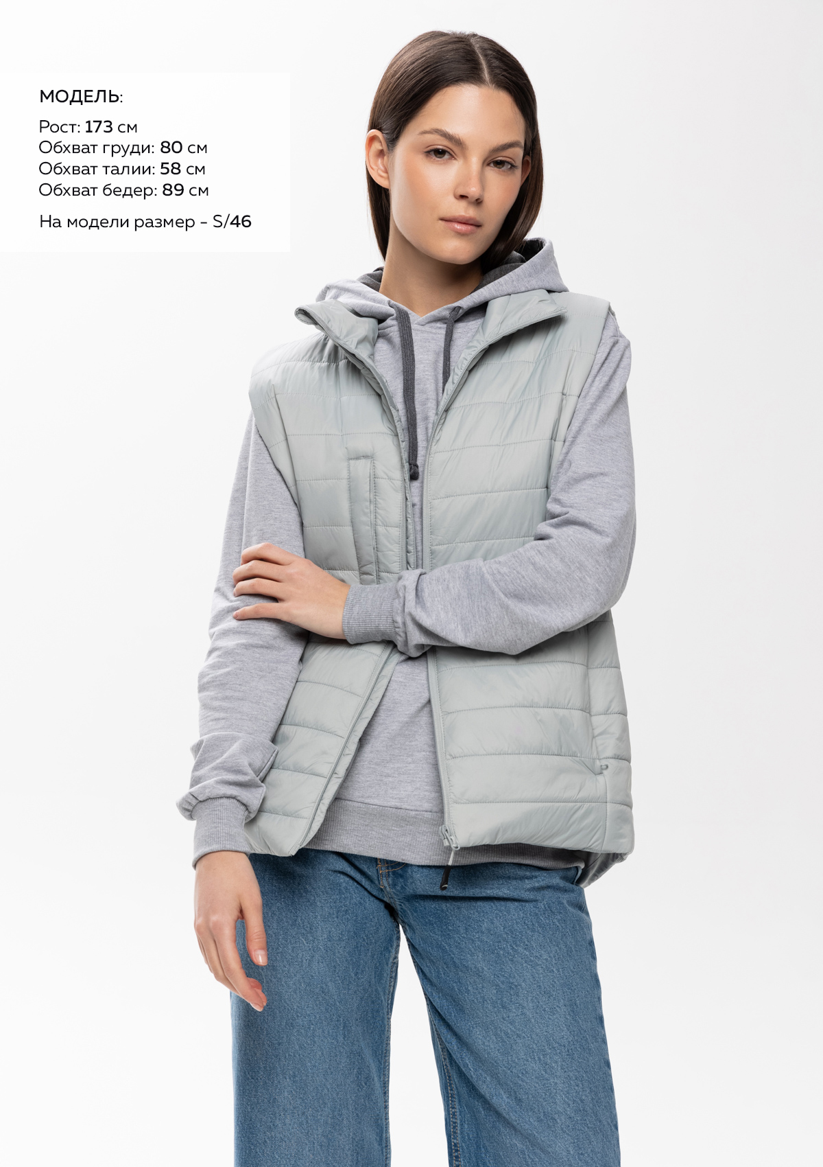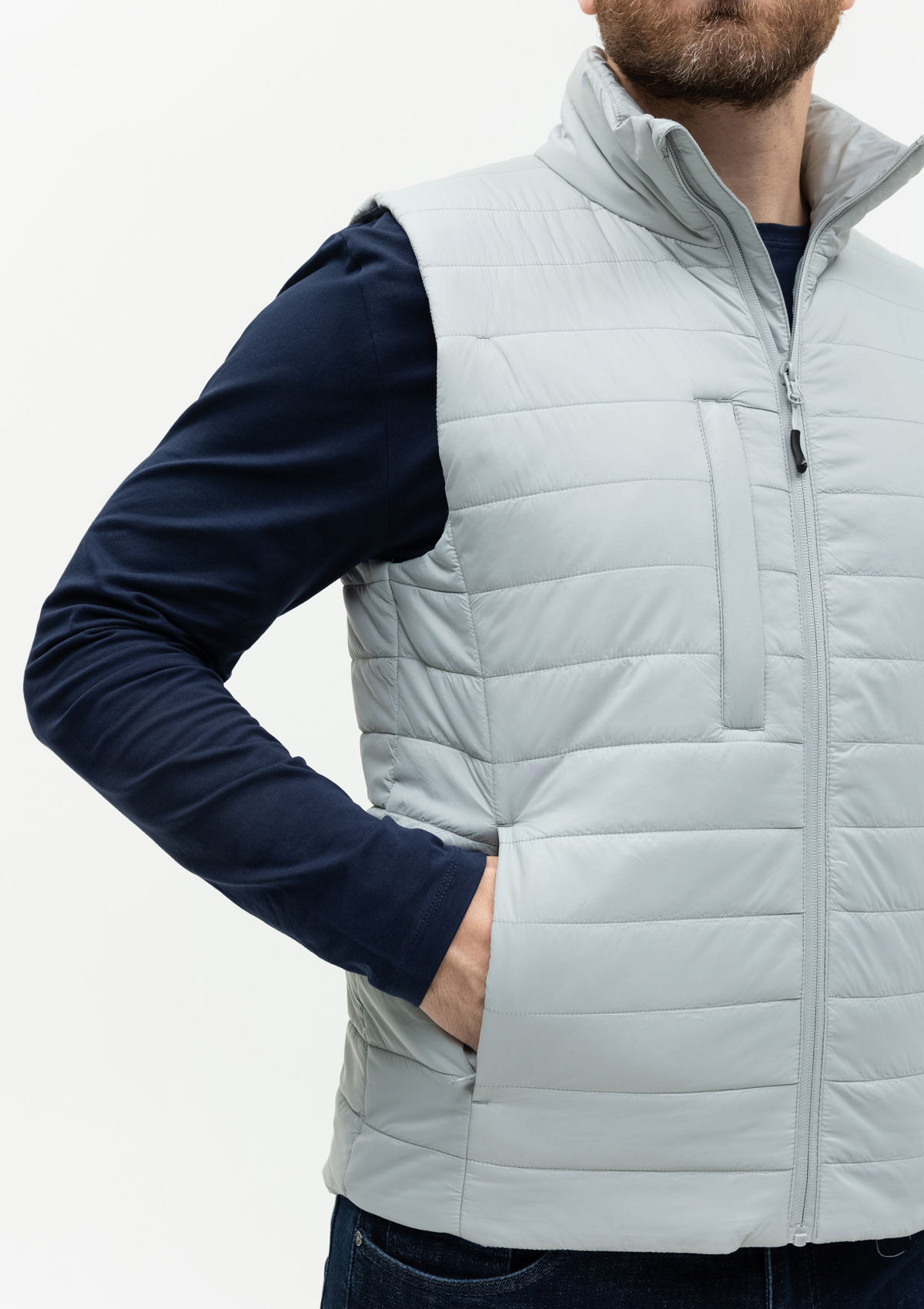 Ультралегкий жилет прямого силуэта с горизонтальной стежкой, воротником-стойкой, функциональным карманом по правой полочке, прорезным карманом и застежкой на молнию с внутренней ветрозащитной планкой. В комплекте прилагается сумка-чехол (технологии нанесения: шелкотрансфер и ДТФ-печать).<br />