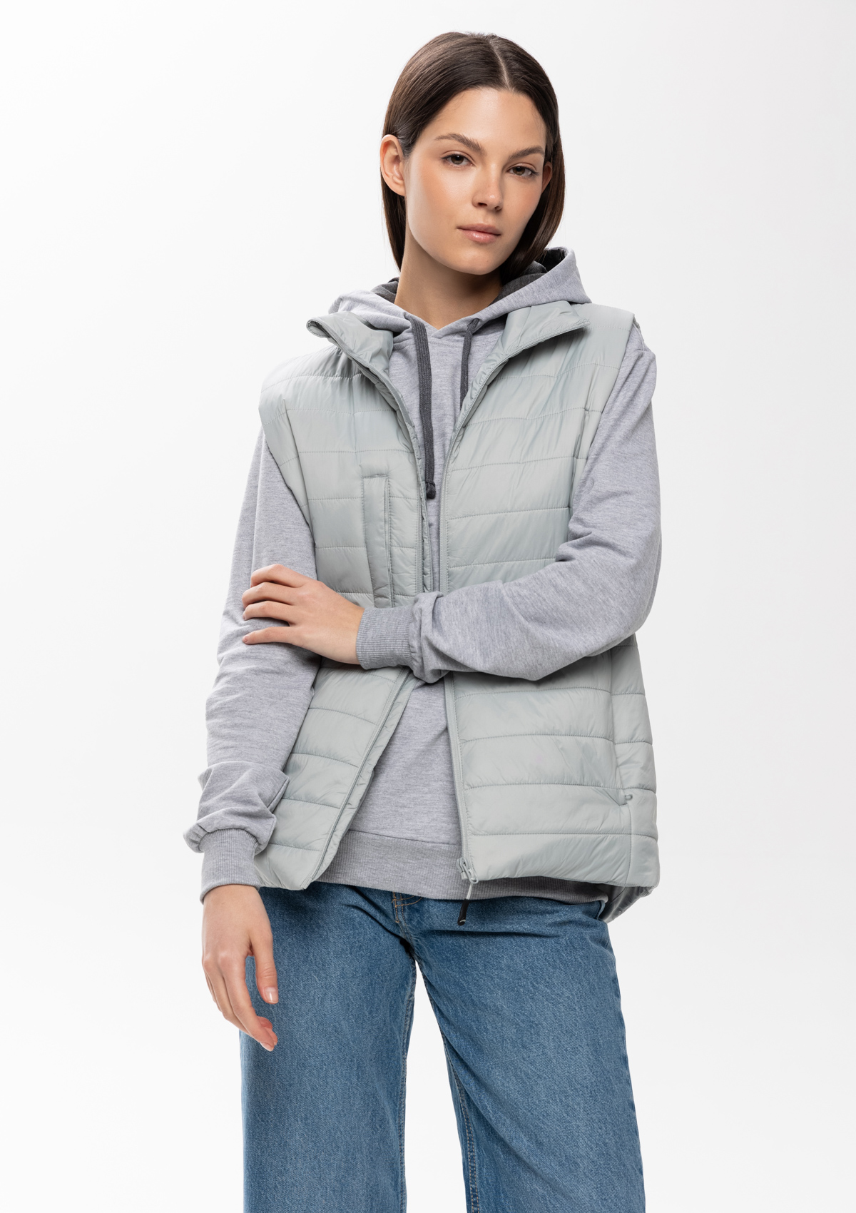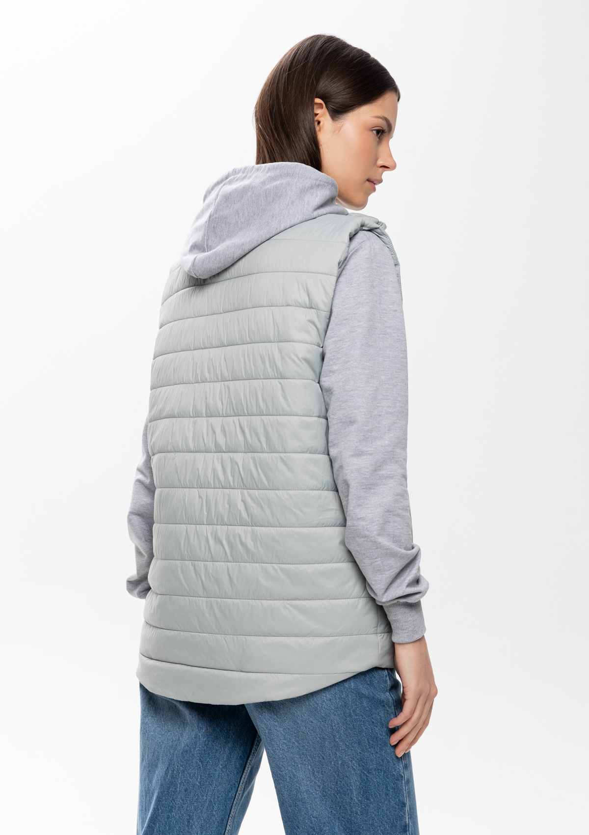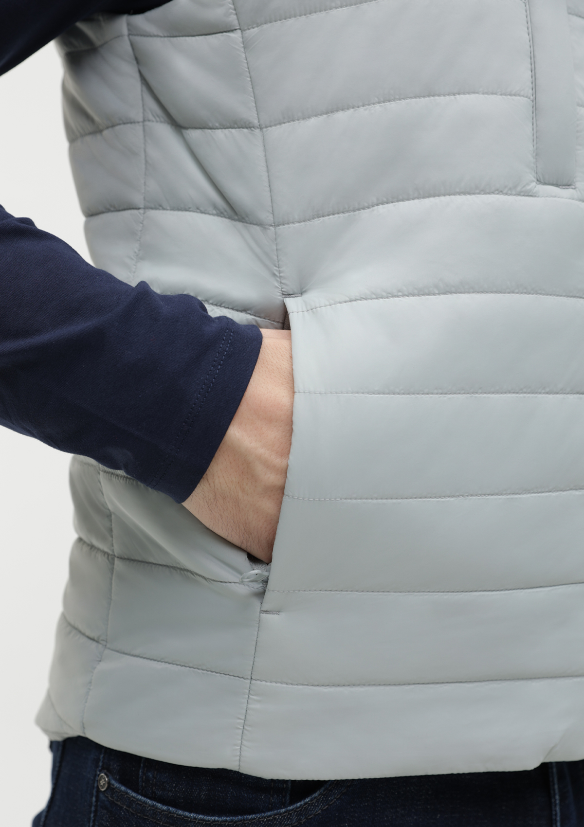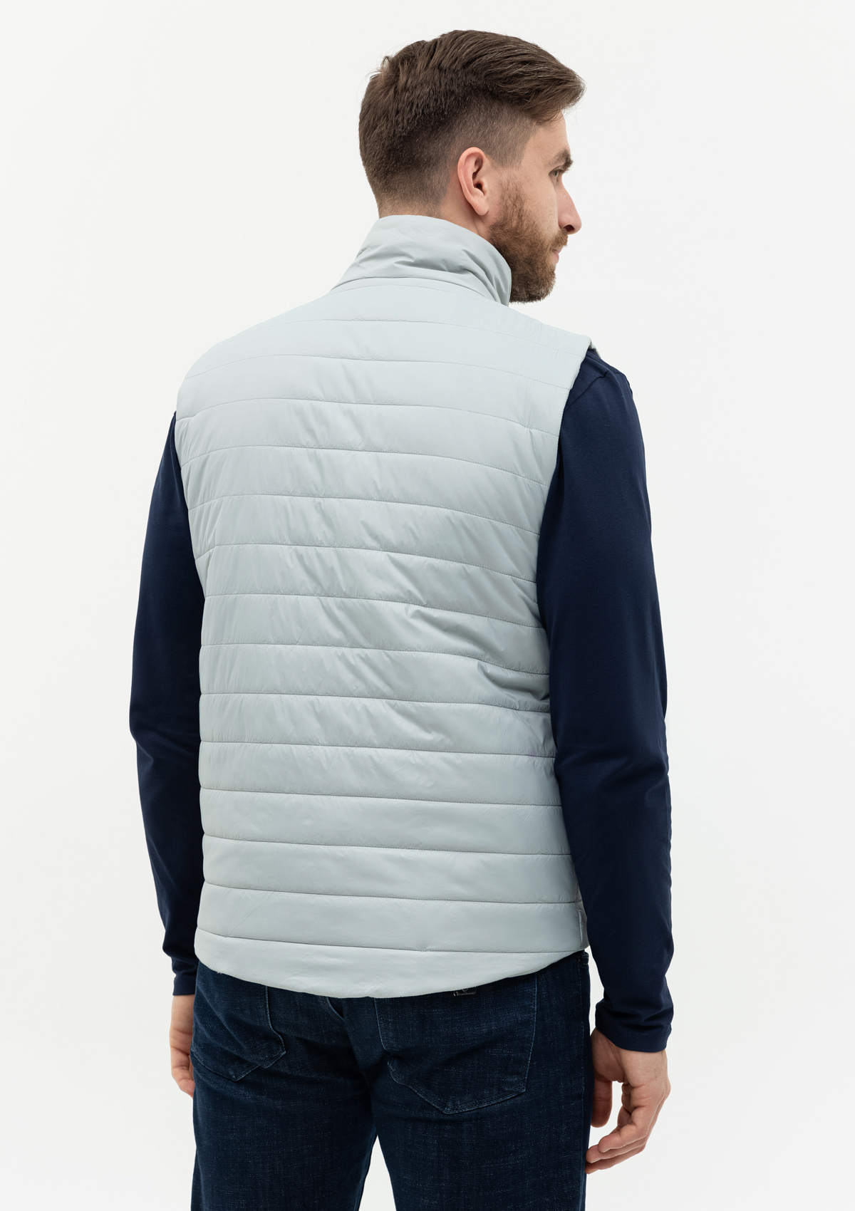 Ультралегкий жилет прямого силуэта с горизонтальной стежкой, воротником-стойкой, функциональным карманом по правой полочке, прорезным карманом и застежкой на молнию с внутренней ветрозащитной планкой. В комплекте прилагается сумка-чехол (технологии нанесения: шелкотрансфер и ДТФ-печать).<br />
