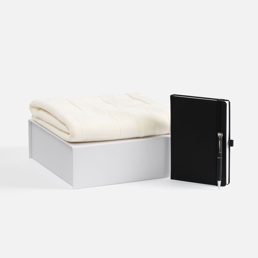 Однотонный набор с основной канцелярией и пледом классика жанра в уютном исполнении. С компактным ежедневинком будет удобно делать заметки в любое время благодаря петельке для ручки любимый пишущий инструмент будет всегда под рукой. АPизысканный акриловый плед с геометрическим узором позволит выразить самые теплые пожелания и ддобавит плавных линий в интерьер.Характеристики:
