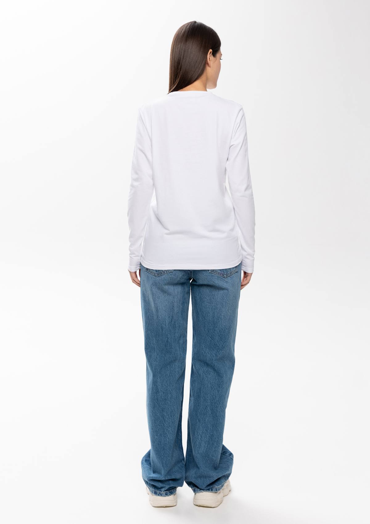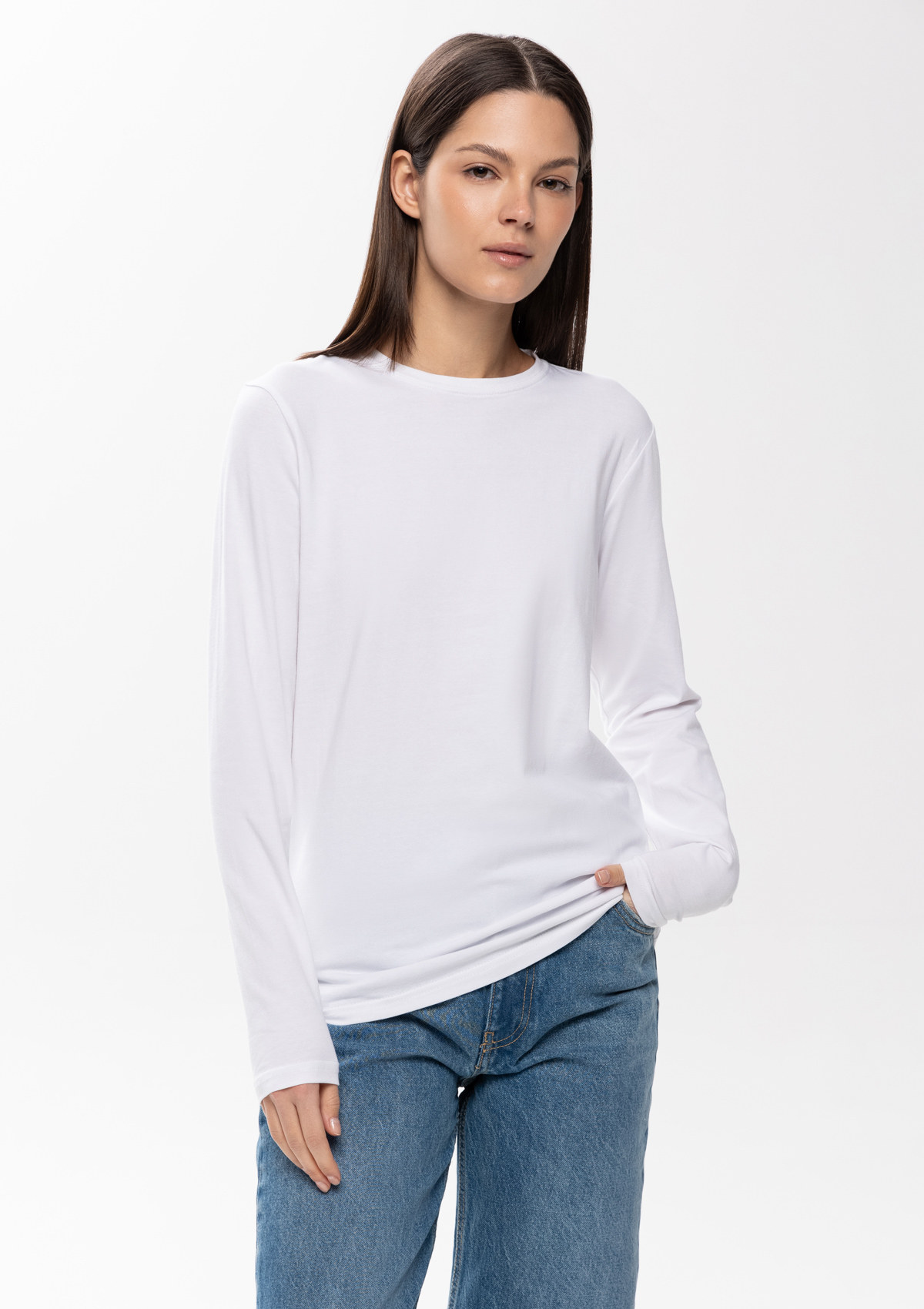 Универсальная футболка прямого силуэта с округлым воротом и длинным втачным рукавом. Плечевые швы и шов горловины усилены настрочной бейкой из основного полотна.<br />